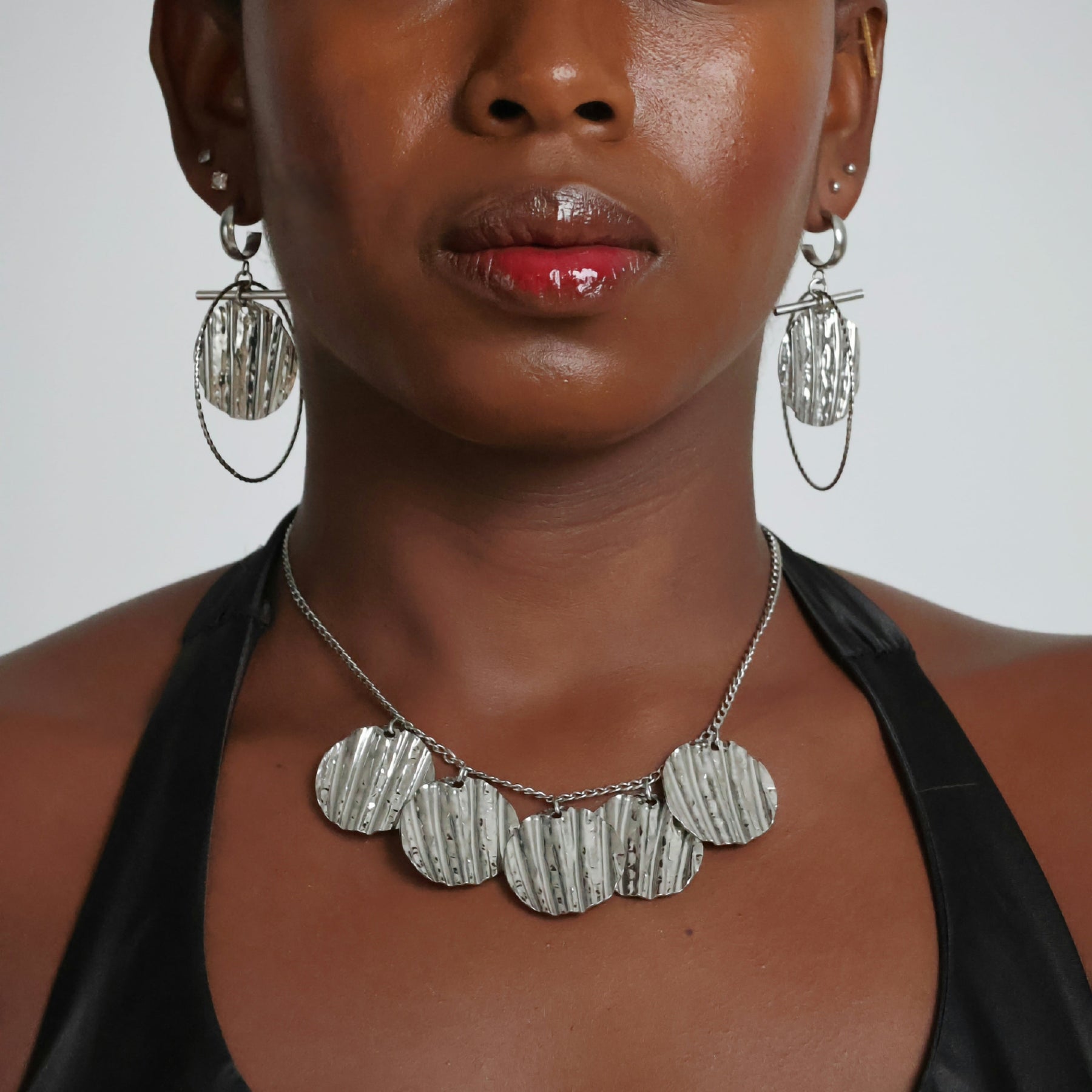 Ce collier Odun Asma de 40 cm met en valeur une série de breloques rondes estampées, dont les reliefs captent la lumière avec finesse. En acier argenté, il offre un éclat durable et une présence raffinée. Avec ses 28 g, il se porte comme une pièce élégante et expressive, parfaite pour sublimer un décolleté.
